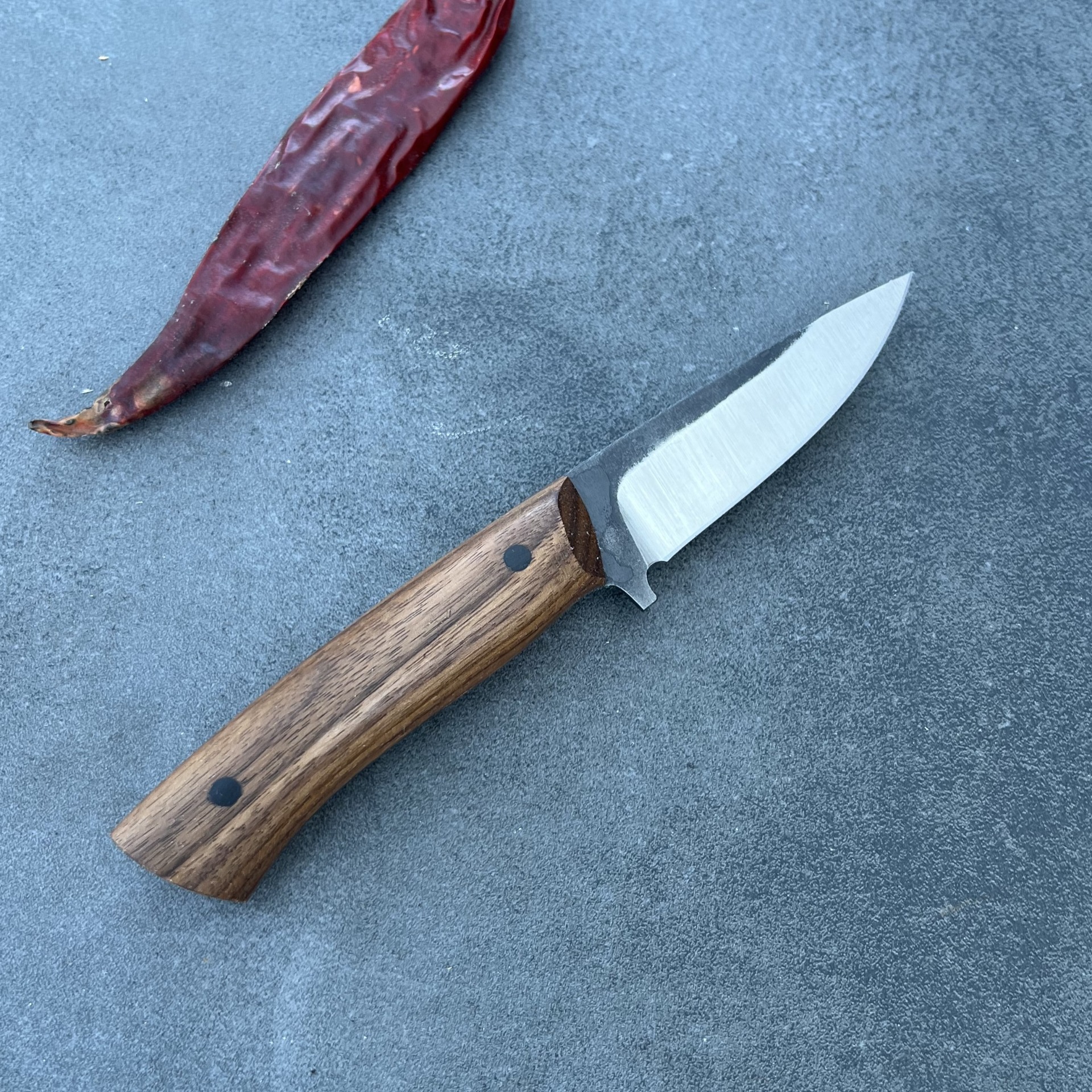 Tento nůž jsem navrhl pro ty, kteří upřednostňují nekompromisní řezný výkon. Ručně kovaná čepel z oceli 14 260 je opatřena čočkovitým výbrusem, který dává ostří neuvěřitelnou sílu při zachování vysoké řezivosti – nůž se v řezu nesvírá a hravě si poradí i s náročnými úkoly, kde by jiná ostří selhala. Je to nástroj pro lovce a znalce, kteří ocení živý charakter uhlíkové oceli a její přirozenou patinu.