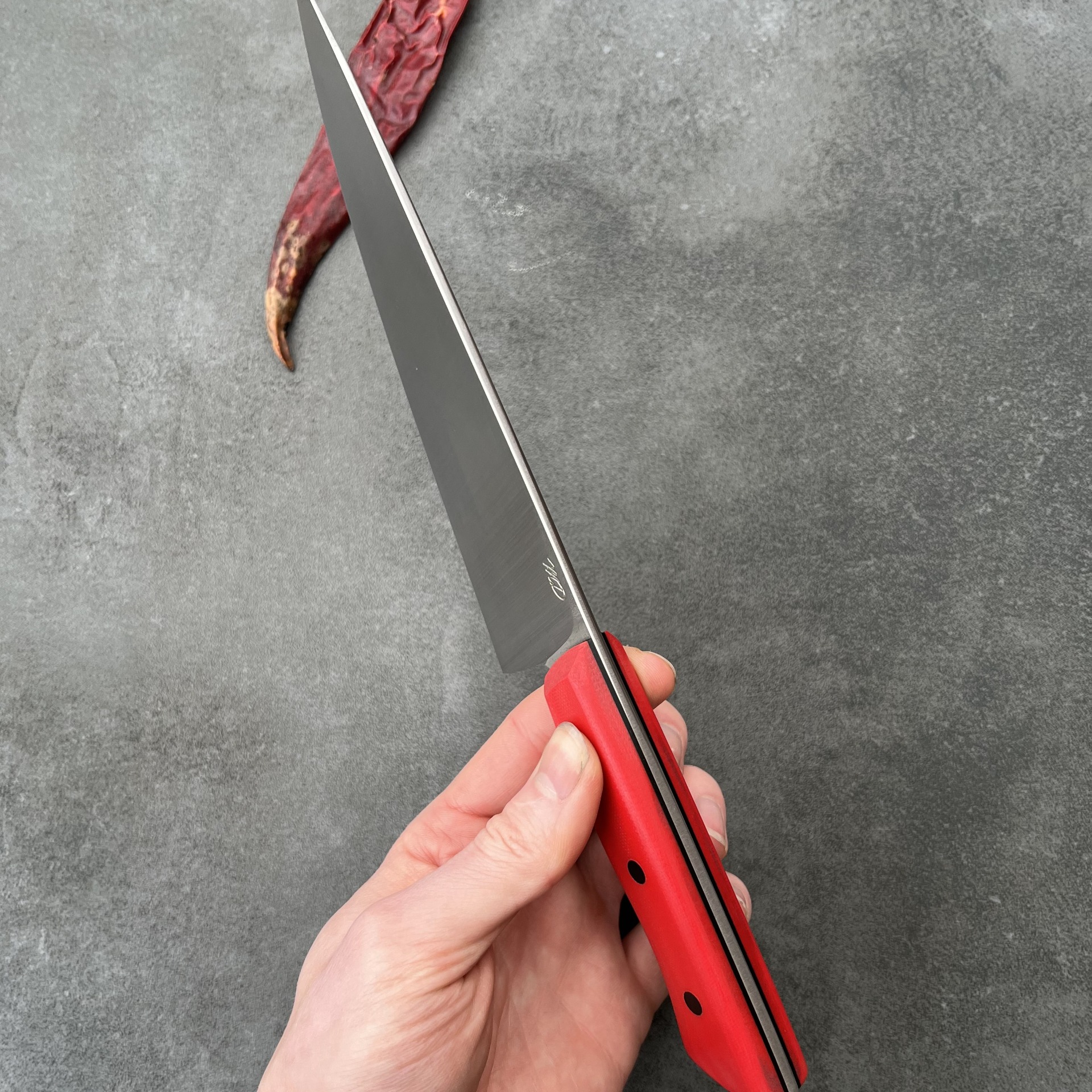 Tento nůž jsem navrhl pro maximální využití při každodenní práci v kuchyni. Široká a pevná čepel z oceli z prémiové oceli AE-L vám umožní provádět dokonale čisté řezy skrz zeleninu, maso i ryby, aniž byste ztráceli kontrolu nad hloubkou řezu. Je to nástroj pro kuchaře, gurmány i domácí nadšence, kteří vyžadují ostrost a chtějí mít každý pohyb nože po prkýnku plně pod kontrolou.
