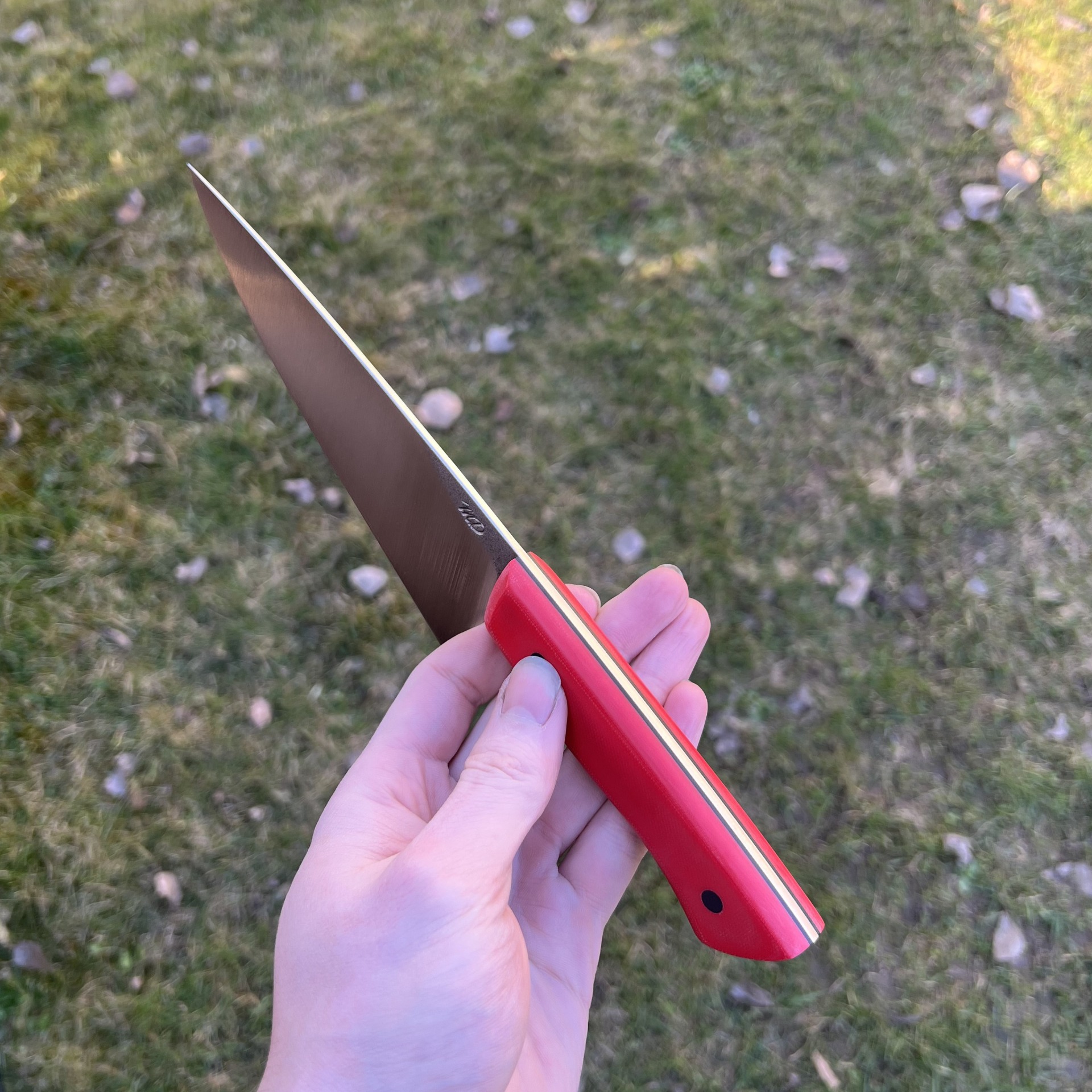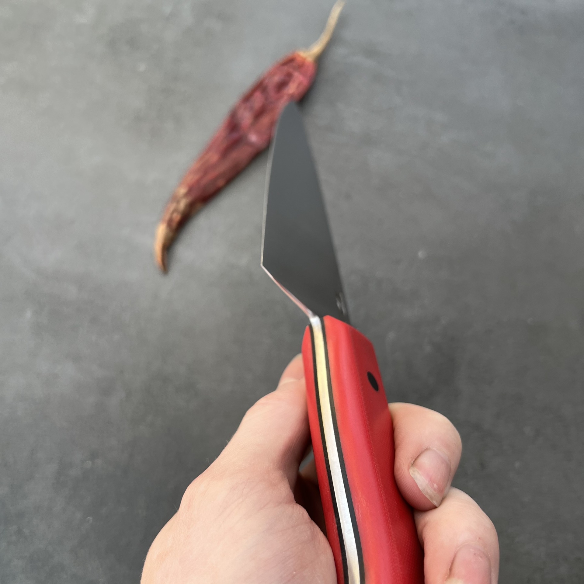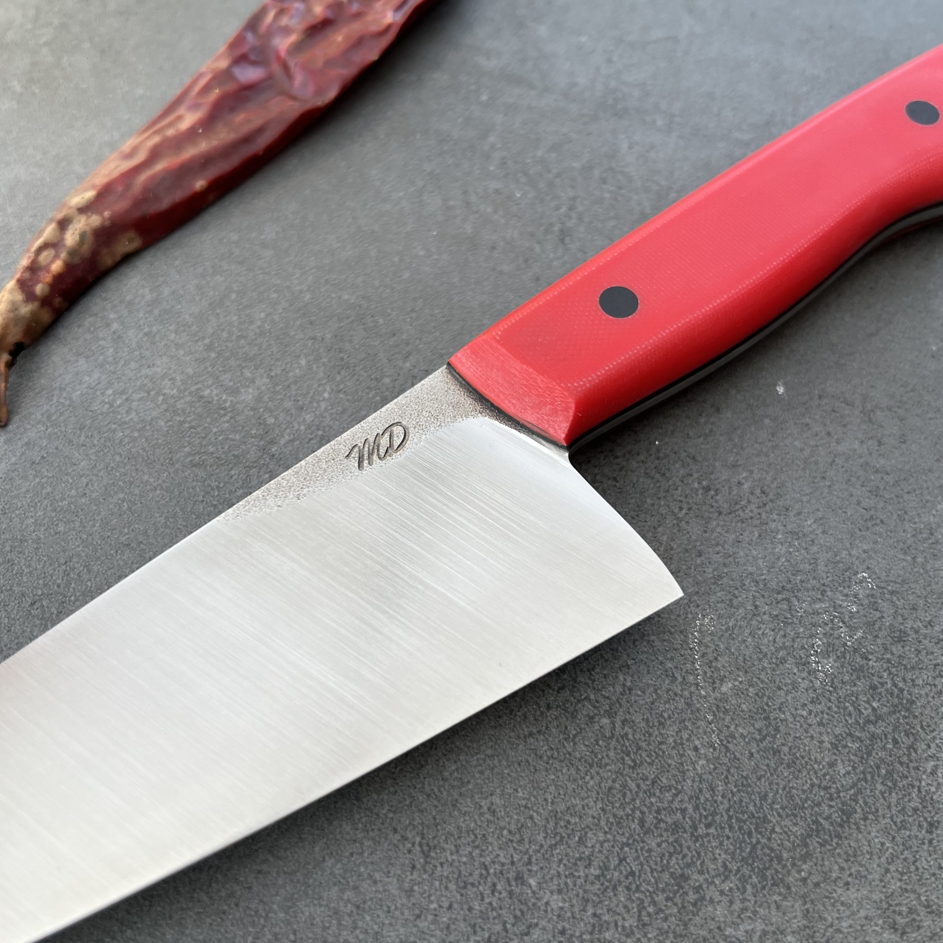 Tento nůž jsem navrhl pro maximální využití při každodenní práci v kuchyni. Široká a pevná čepel z oceli z prémiové oceli N690 vám umožní provádět dokonale čisté řezy skrz zeleninu, maso i ryby, aniž byste ztráceli kontrolu nad hloubkou řezu. Je to nástroj pro kuchaře, gurmány i domácí nadšence, kteří vyžadují ostrost a chtějí mít každý pohyb nože po prkýnku plně pod kontrolou.
